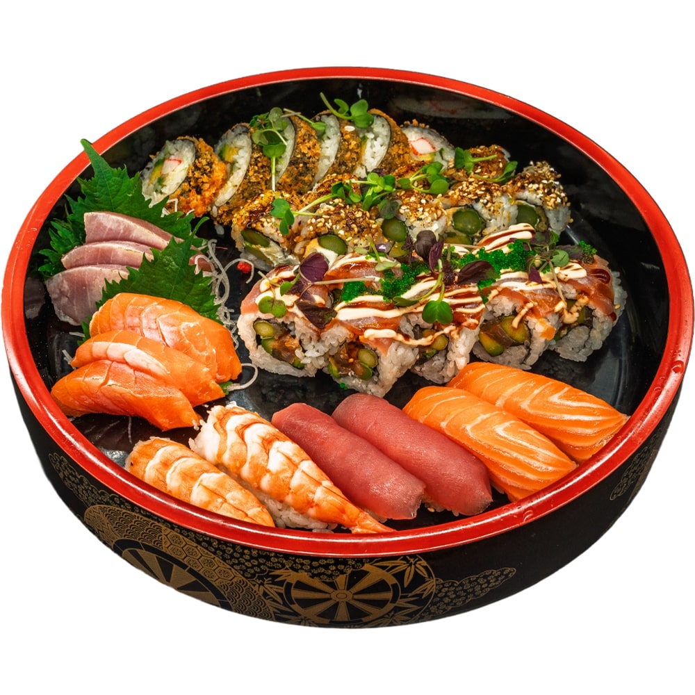 6 Ngiri+ 2 Spezial Rollen+6 Sashimi+ 1 Crunchy(6 pieces Nigiri, 2 special rolls, 6 slices flambéed sashimi, 1 crunchy rolls)