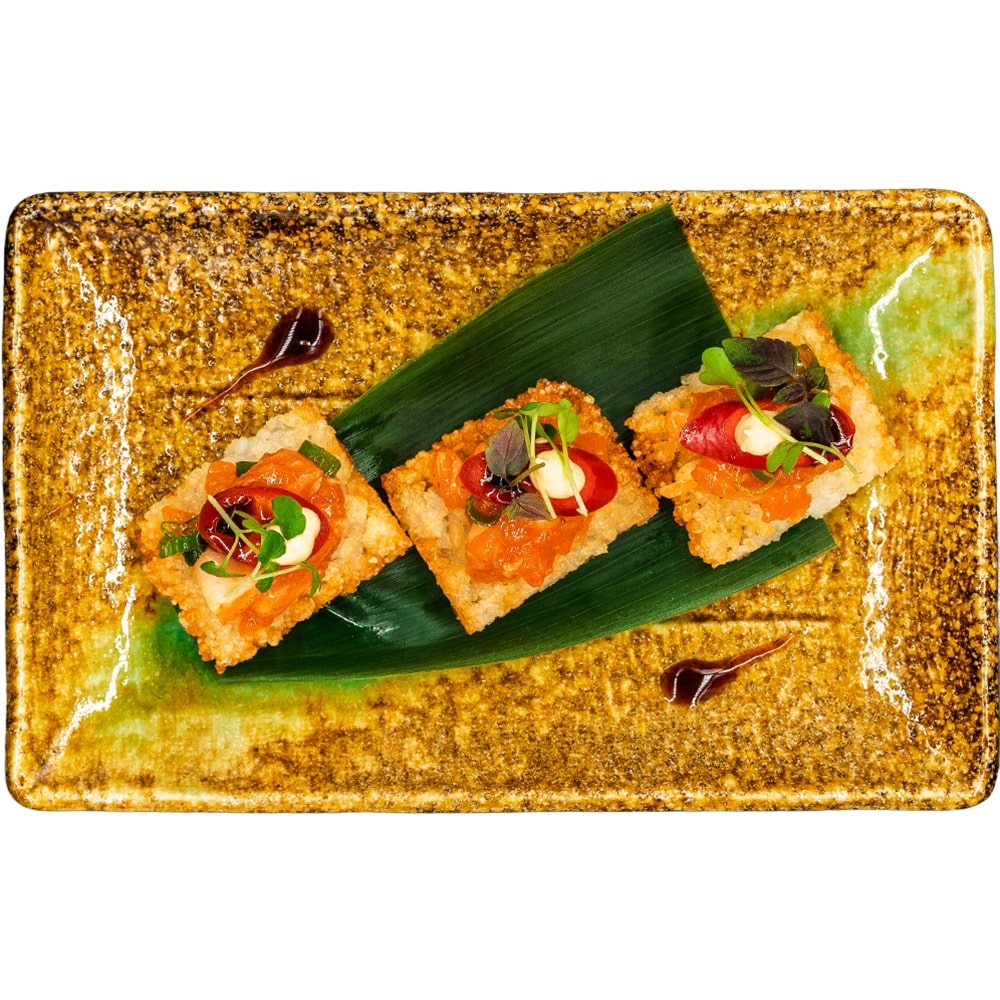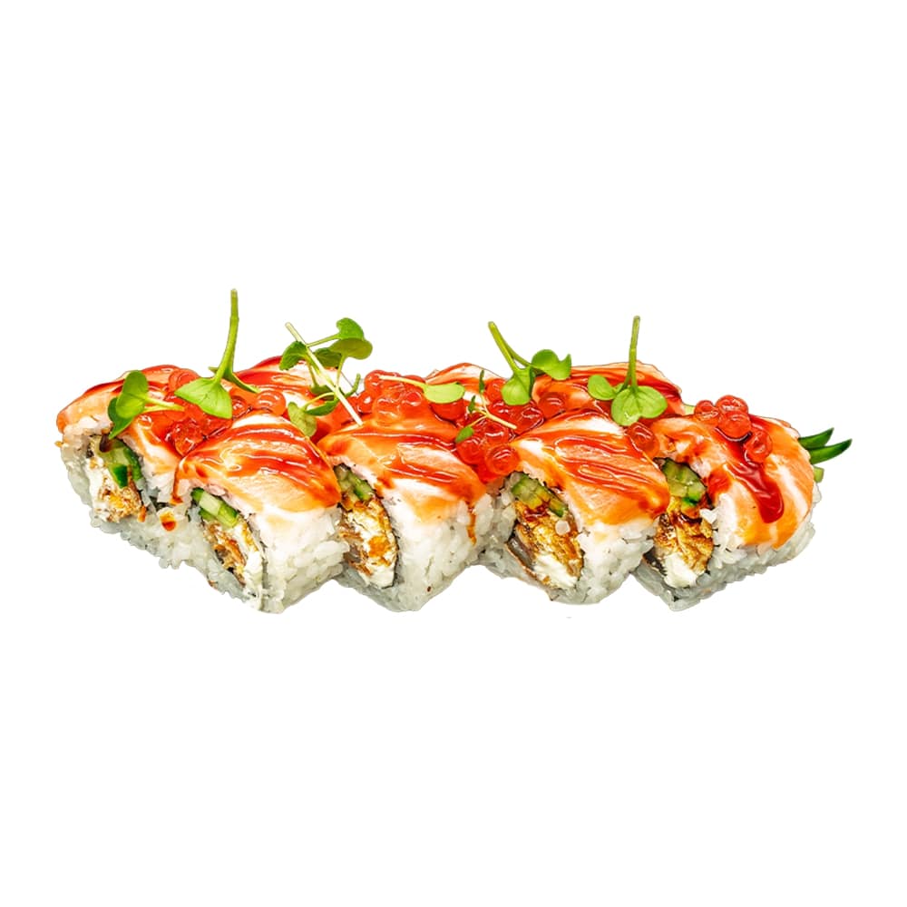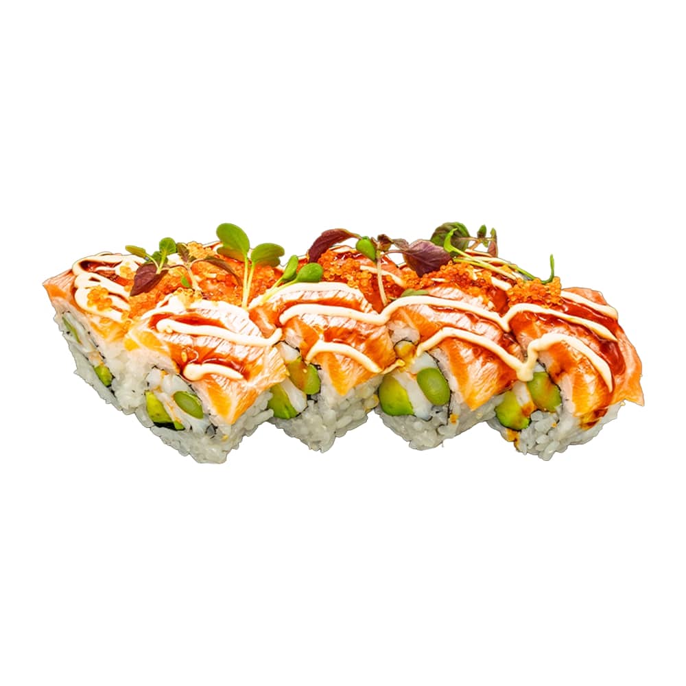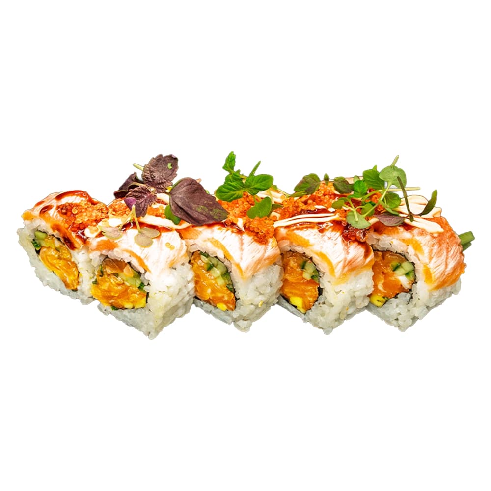 Garnelen Avocado, Spargel, flambierter Lachs on top, Flugfischkaviar, Chli-Mayo, Unagi Sauce(salmon tartar, mango, cucumber, flambéed salmon on top, flying fish roe, chili mayo, Unagi sauce)
