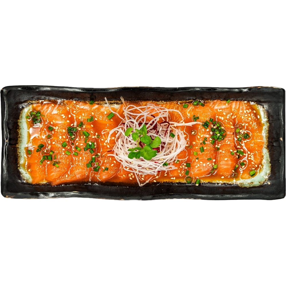 Pikantes Lachstatar, Mango, Gurken, flambierter Lachs on top, Flugfischkaviar, Chli-Mayo, Unagi Sauce(salmon tartar, mango, cucumber, torched salmon on top, flying fish roe, chili mayo, Unagi saucee)