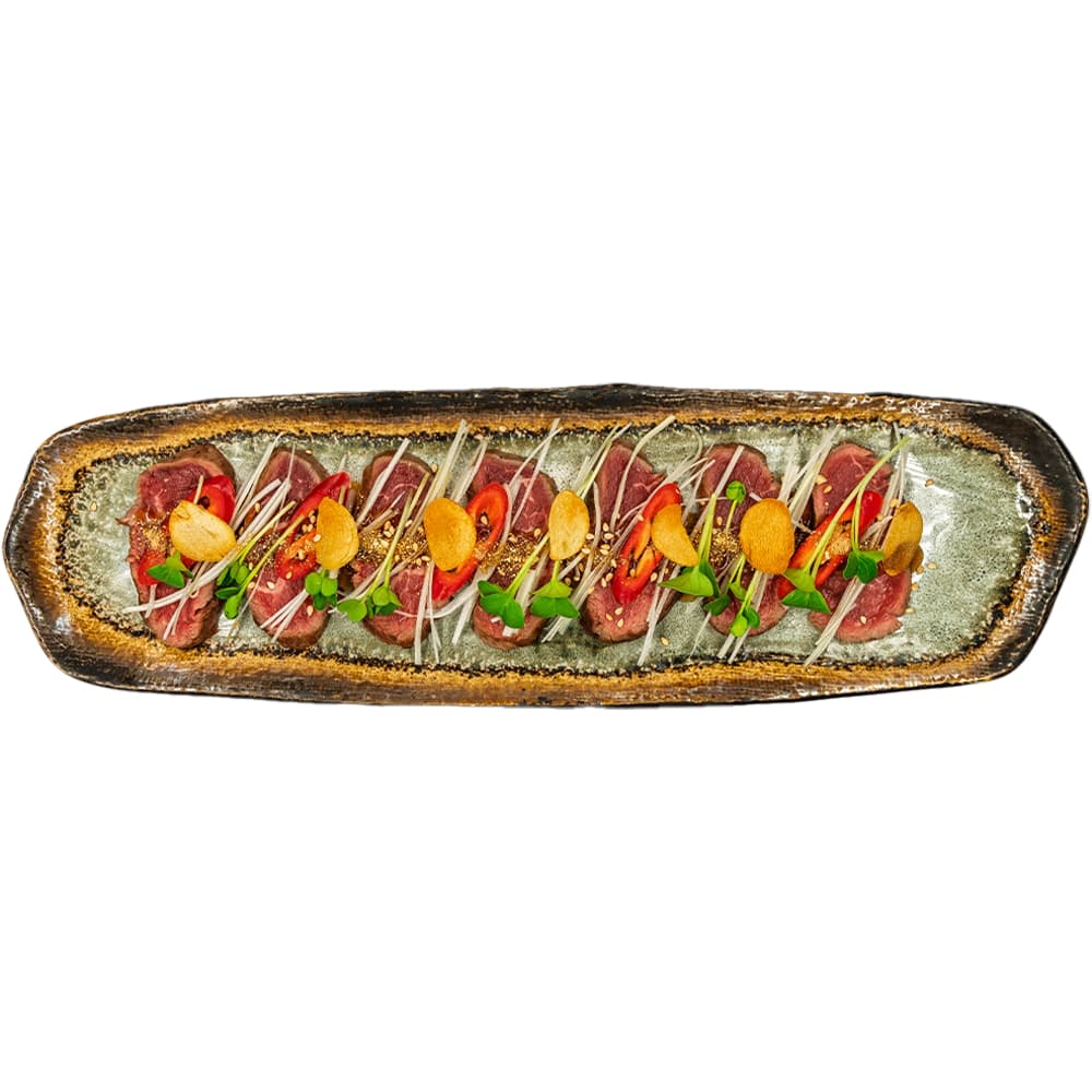 Leicht gegrilltes Rindfleisch mit Chili-Ponzusauce. (slightly grilled beef with chili ponzu sauce)