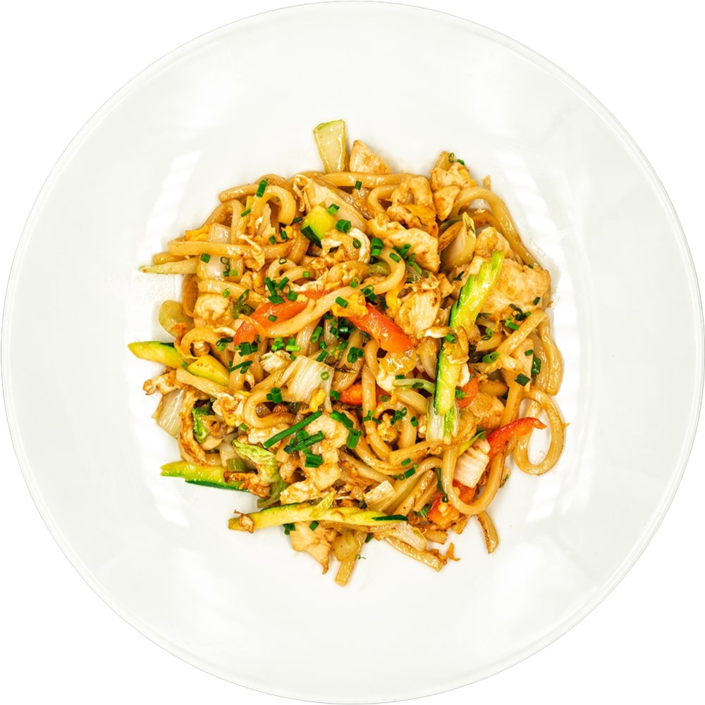 Knusprige Entenwürfel mit Paprika, Zwiebeln, Koriander, Limetten-Fischsauce (lauwarm). (crispy duck cubes with peppers, onions, coriander, lime fishsauce (lukewarm))