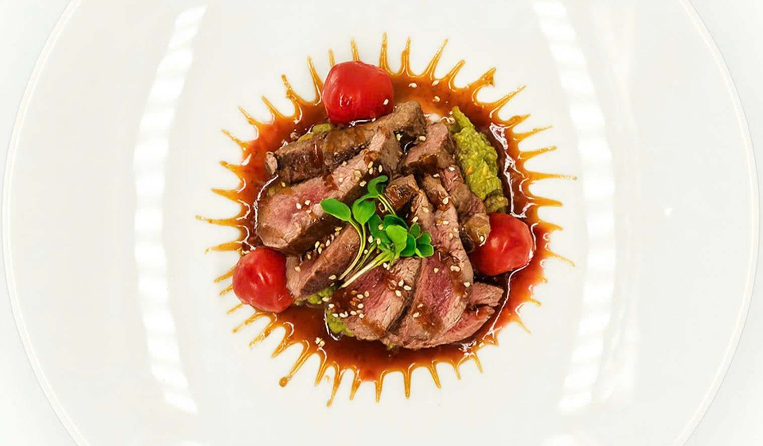 Leicht gegrilltes Rindfleisch mit Chili-Ponzusauce. (slightly grilled beef with chili ponzu sauce)
