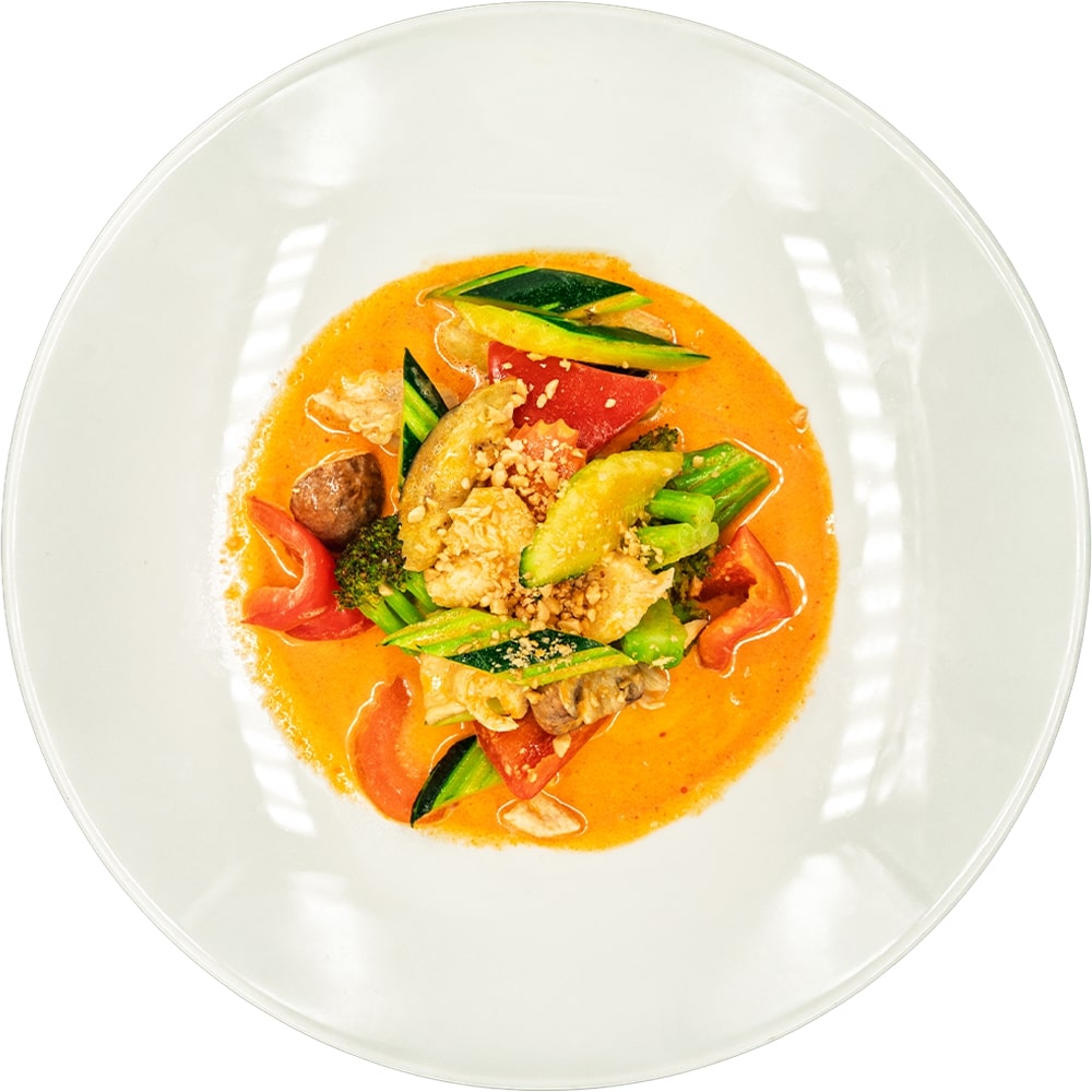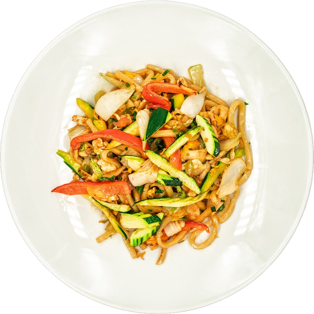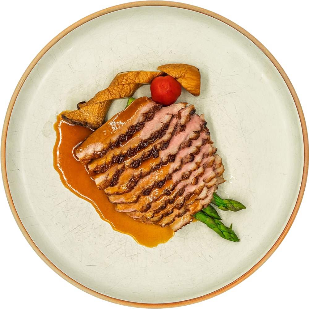 Knusprige Entenwürfel mit Paprika, Zwiebeln, Koriander, Limetten-Fischsauce (lauwarm). (crispy duck cubes with peppers, onions, coriander, lime fishsauce (lukewarm))