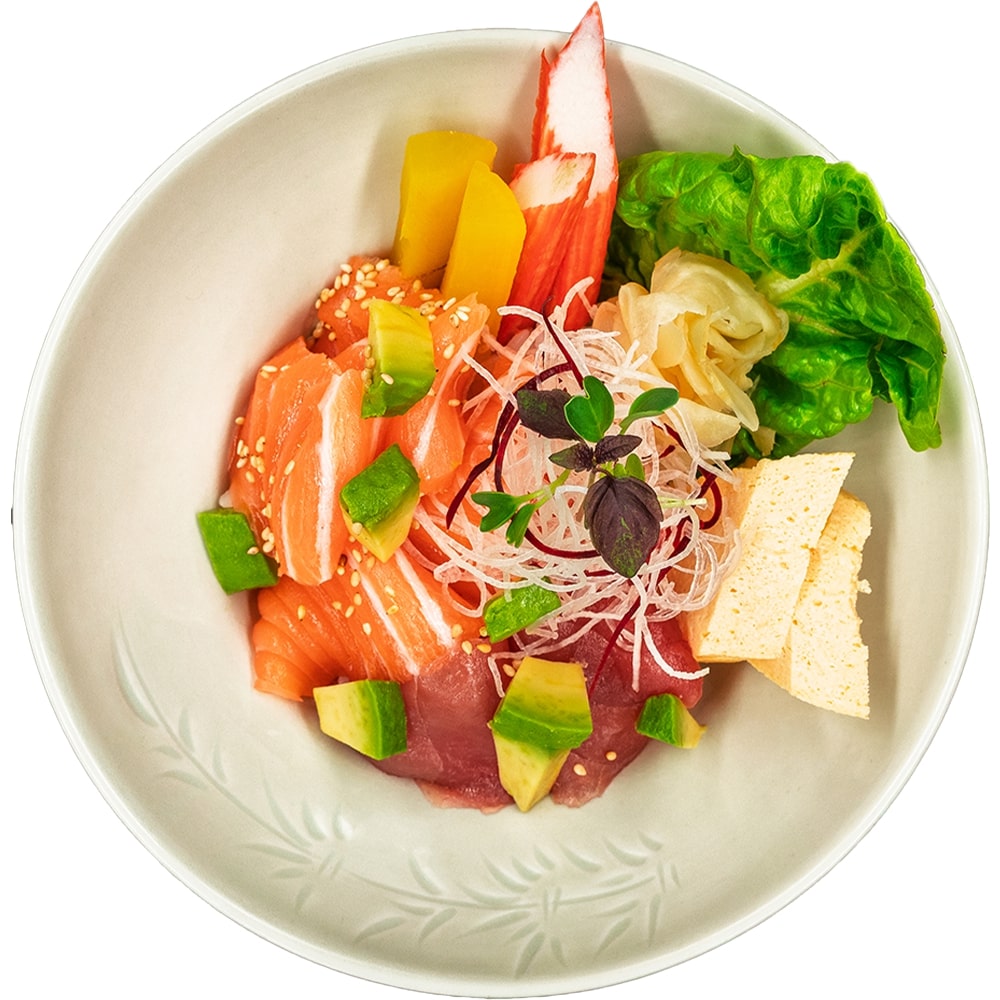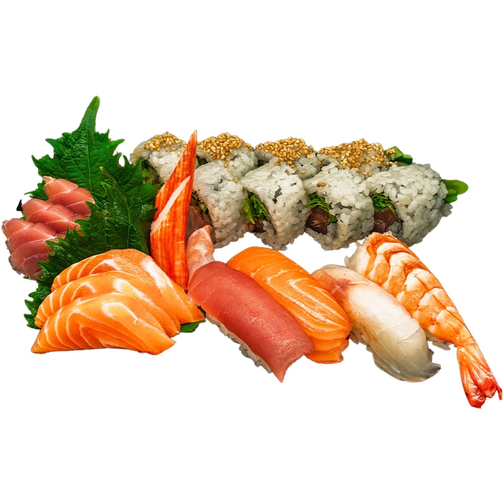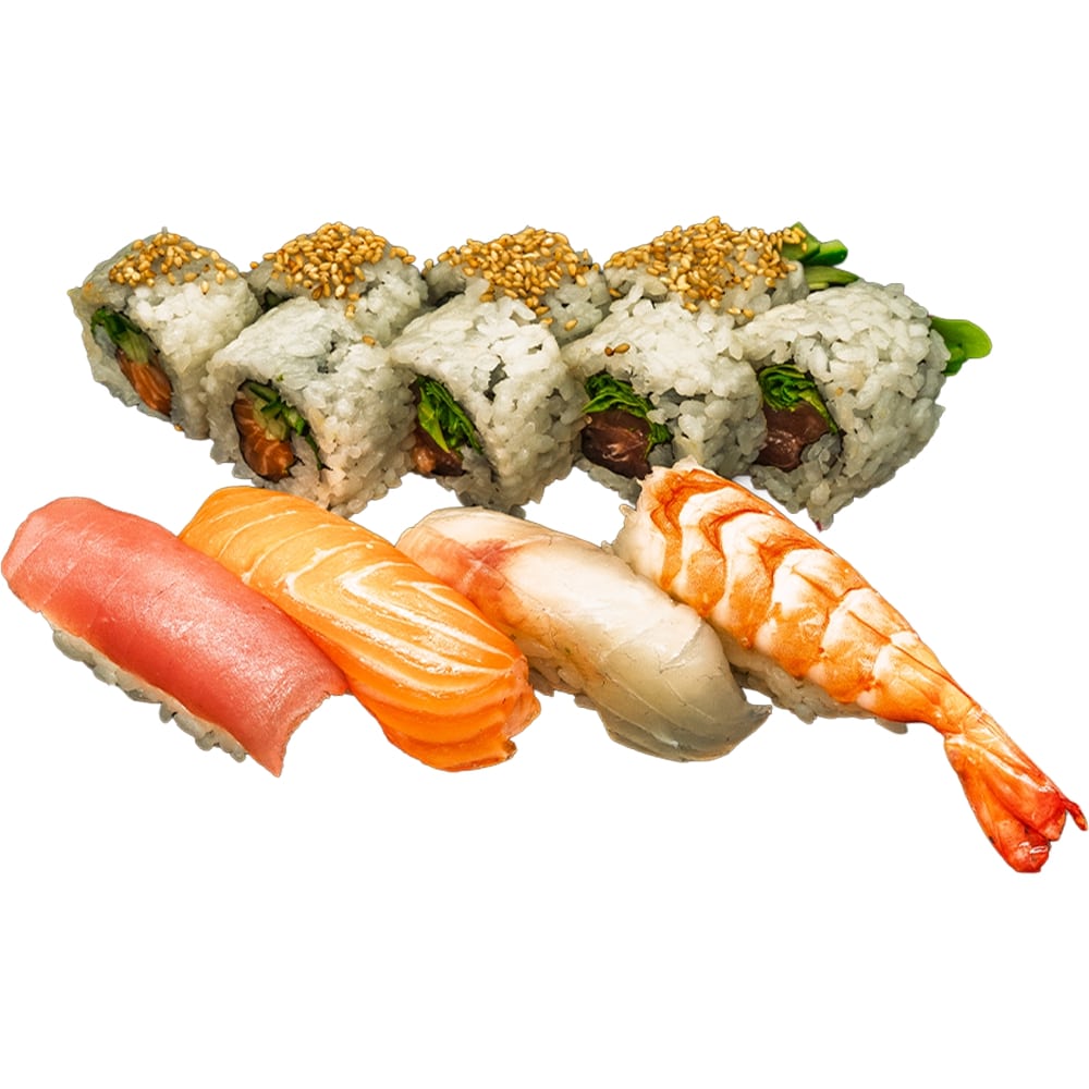 4 Nigiri + 1 Uramaki + 6 Sashimi(4 pieces Nigiri sushi, 1 inside out roll, 6 slices sashimi)