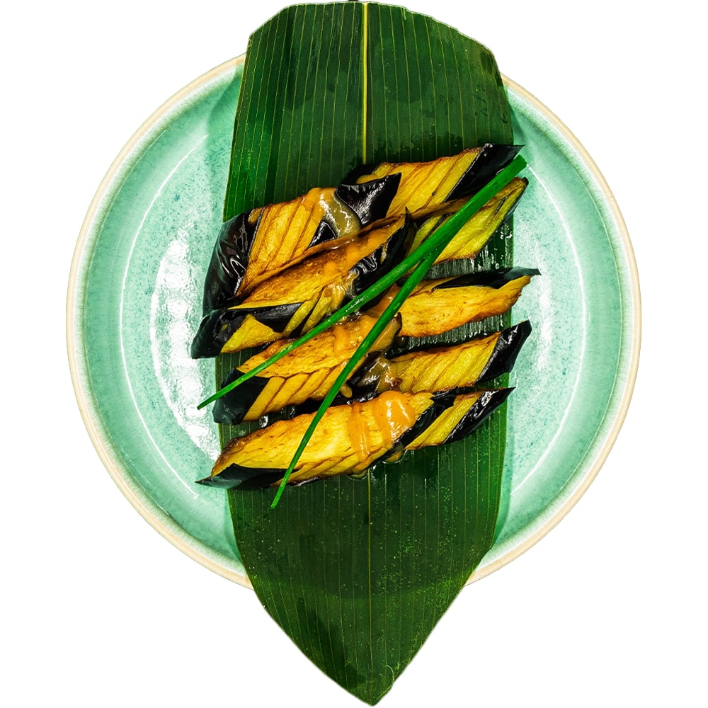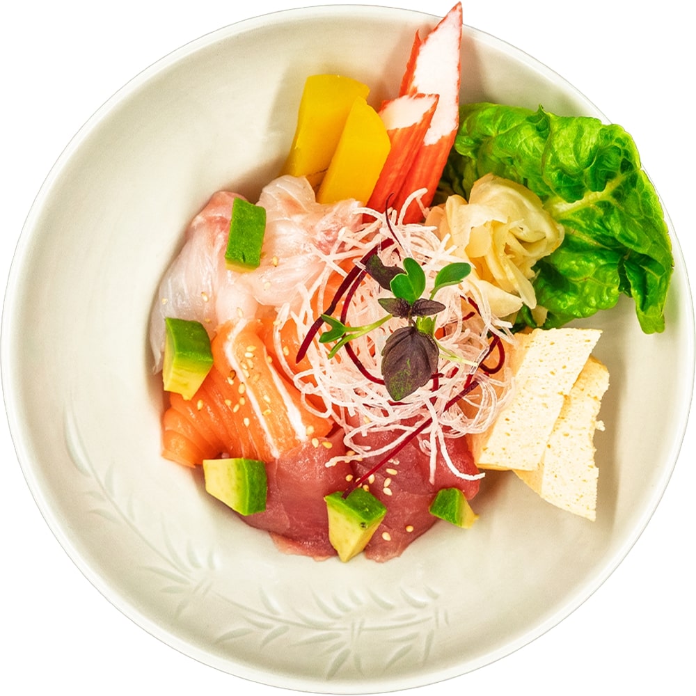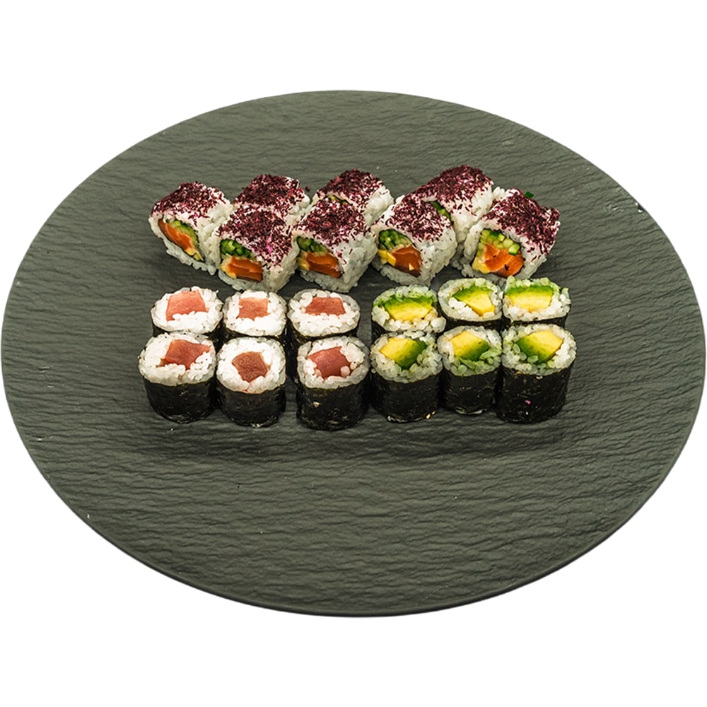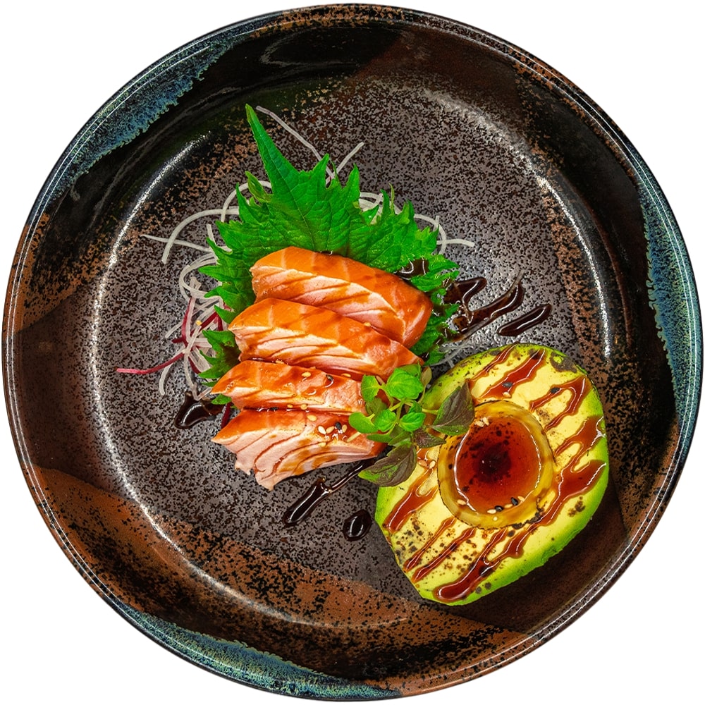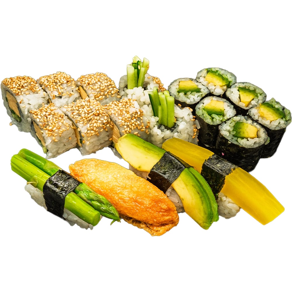 6 Ngiri+ 2 Spezial Rollen+6 Sashimi+ 1 Crunchy(6 pieces Nigiri, 2 special rolls, 6 slices flambéed sashimi, 1 crunchy rolls)