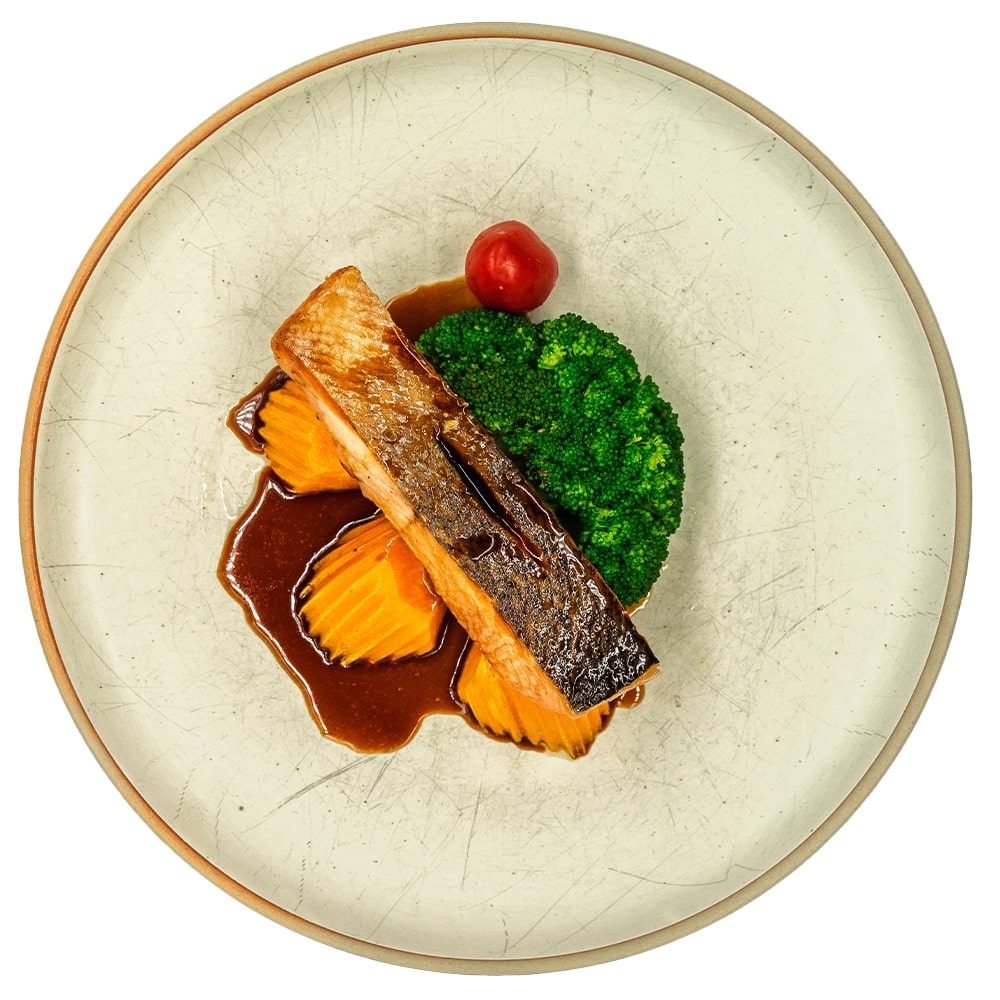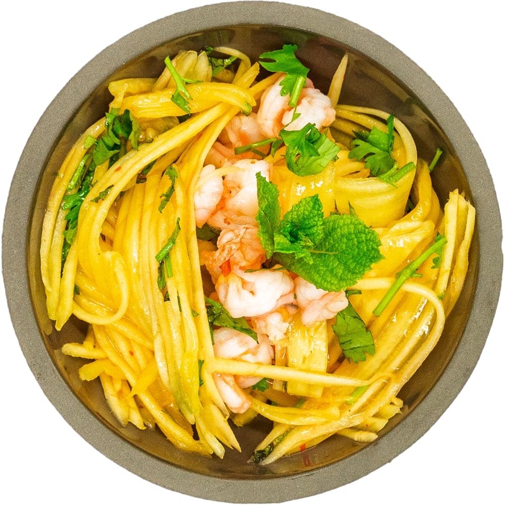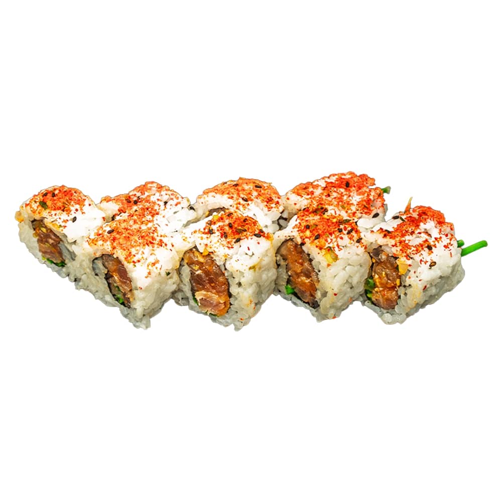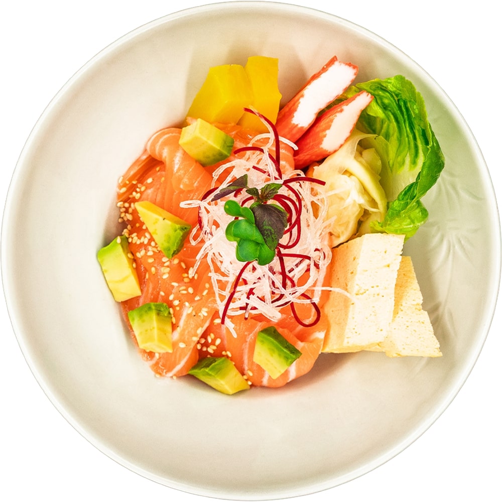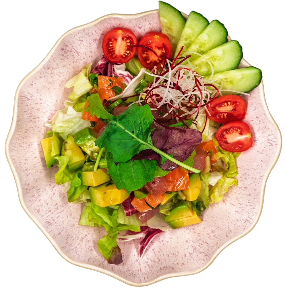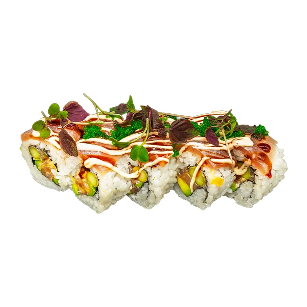 Garnelen Avocado, Spargel, flambierter Lachs on top, Flugfischkaviar, Chli-Mayo, Unagi Sauce(salmon tartar, mango, cucumber, flambéed salmon on top, flying fish roe, chili mayo, Unagi sauce)