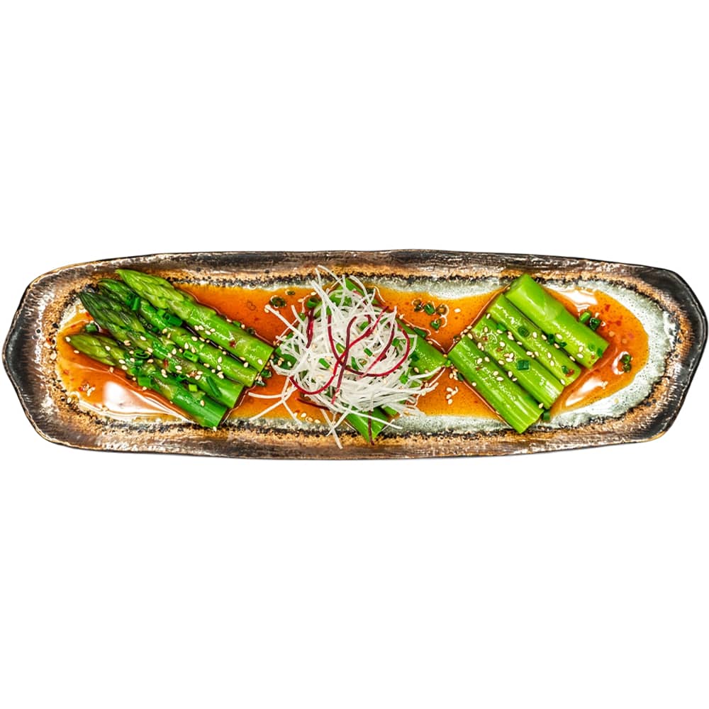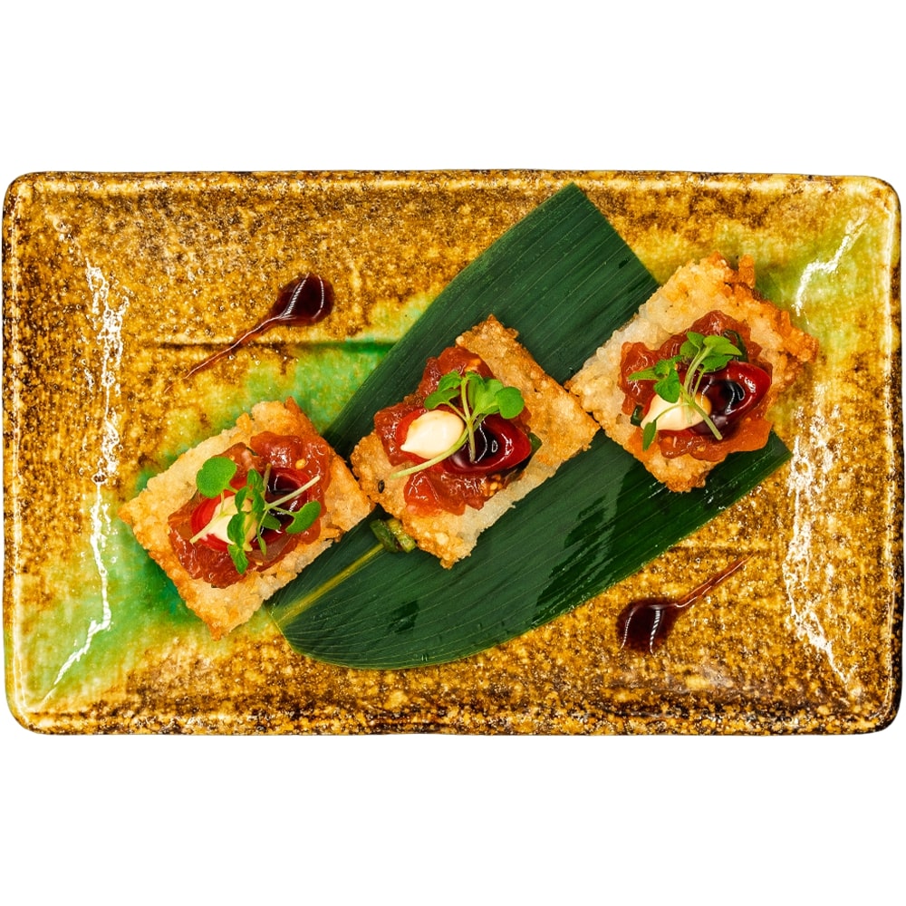 Pikantes Thunfischtatar, Spargel, Avocado, flambierter Thunfisch on top, Flugfischkaviar, Chli-Mayo, Unagi Sauce(tuna tartar, asparagus, avocado, flambéed tuna on top, flying fish roe, chili mayo, eel sauce)