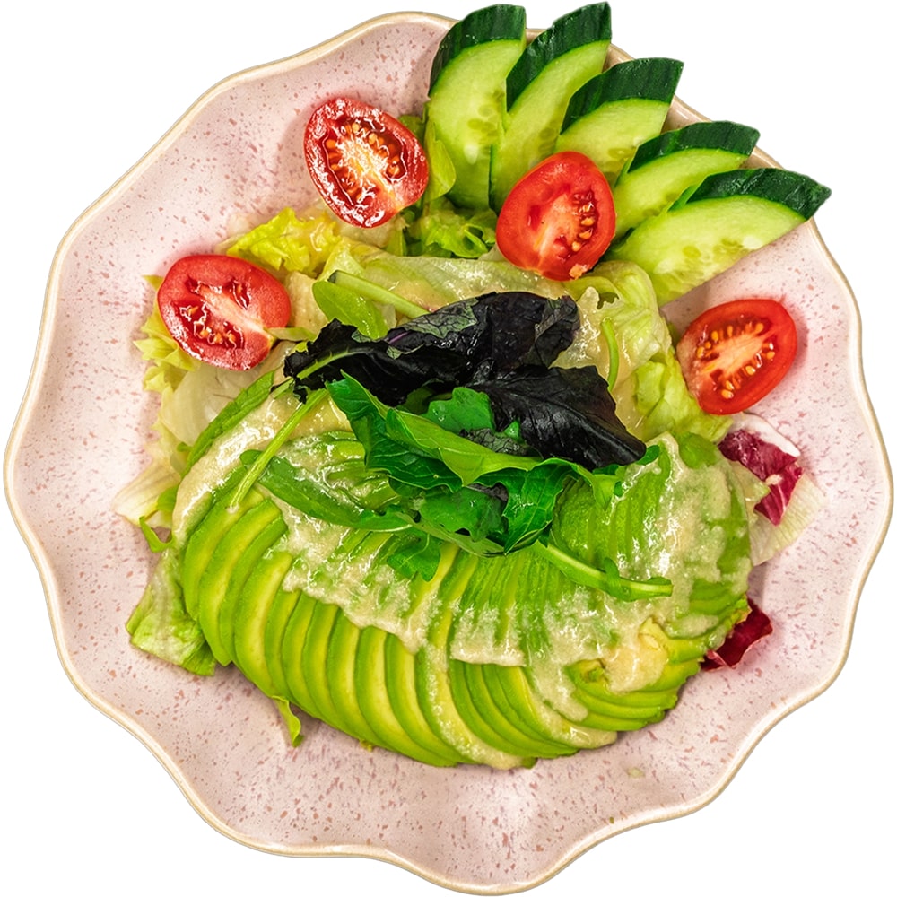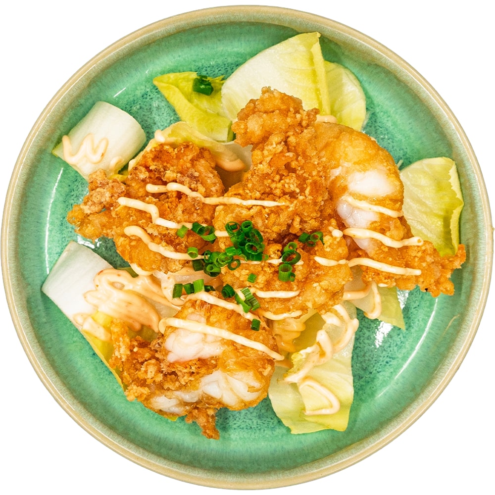 Panierte Garnelen Salat , Avocado on top, Tonkatsu-Sauce(fried panko breaded prawns, salad, avocado on top)